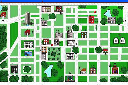 3. The Cafe Paradise 5. TOPS 6. BCUH 7. Carlino's Restaurant 9. Hudson Farm 11. Vicky's House 12. The Daily Grind 13. Church 15. BCPD 17. The Lucky Lady 21. The Cemetery 22. Mary's Place 24. The Cory Estate 25. Cory Publishing 26. The Hair Affair
